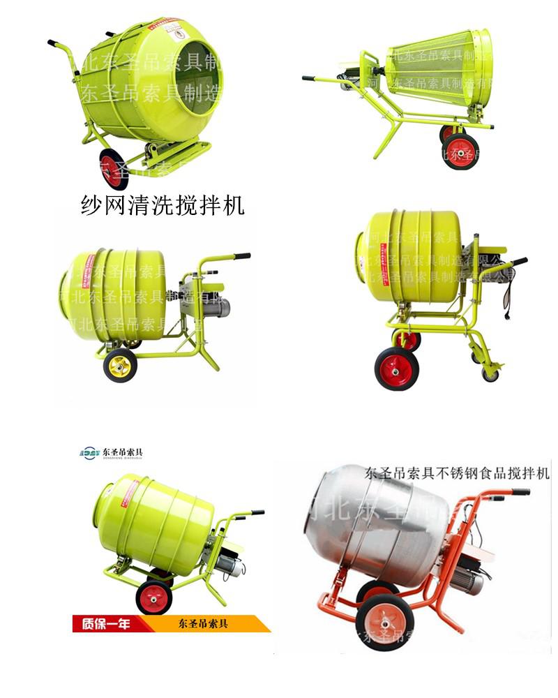 东圣厂家生产多种用途、多种规格型号的小型搅拌机。搅拌水泥砂浆的滚筒式搅拌机,搅拌饲料的饲料搅拌机,搅拌食品的不锈钢搅拌机,清洗药材或者其他物料的清洗搅拌机,对沙子或其他材料进行清洗的筛洗机。