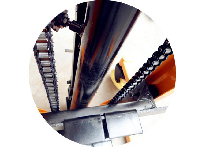 手动液压堆高车使用手柄处两根金属传动链,可不要小瞧。传输液压泵动力全靠它,属于机械传动常见动力传输方式。