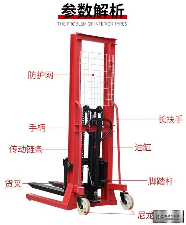 咨询电话:13933276606 液压堆高车 是一种具有搬运和顶升双重功能的手动搬运工具。这种堆高车适用于火工品等较为危险的用品的生产和储存 场合中,取代人工搬运或液压拖车搬运,不