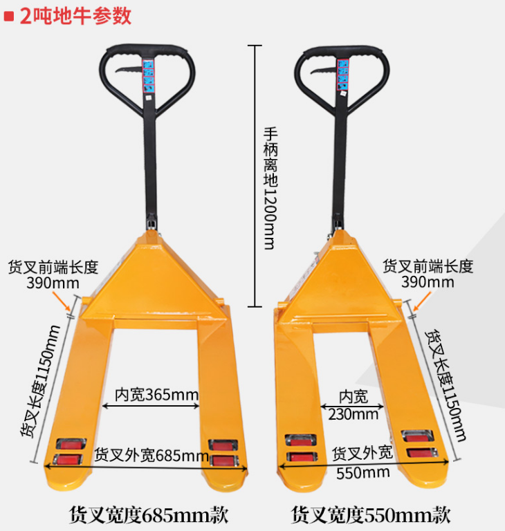 本期文章,将为大家介绍我公司所生产高销量地牛叉车规格列表。本列表将详细介绍地牛产品型号规格,手动液压车细节位置尺寸大小。