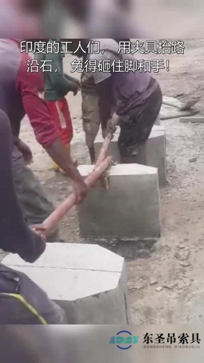 石材吊夹厂家介绍印度自制吊夹。如图所示,印度工人使用自制手抬夹具吊夹路沿石。